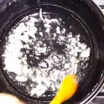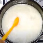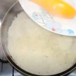 Retire do fogo e despeje esta mistura, ainda quente, por cima do polvilho, acrescentando em seguida os ovos e por último o sal. Mexa bem até obter uma massa homogênea e firme.
