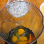 No liquidificador, adicione os ovos, o óleo, o açúcar e o leite e bata por uns 3 minutos ou até que todos os ingredientes estejam devidamente misturados.