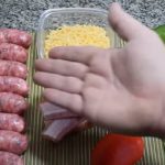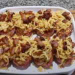 Em seguida, adicione a cebola, o bacon, o molho de tomate, os temperos, a pimenta e deixe secar completamente.