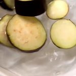 Lave e corte as berinjelas em rodelas grossas, com altura de cerca de 2 cm. Coloque-as em uma tigela e cubra com água. Reserve desta maneira por aproximadamente 20-30 minutos.