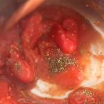 Enquanto isso, prepare o molho. Leve uma panela em fogo médio e coloque o azeite. Refogue rapidamente o alho picado e em seguida adicione os tomates pelados. Tempere com sal, pimenta do reino preta moída, orégano e manjericão a gosto. Assim que levantar fervura, abaixe o fogo e deixe cozinhar, misturando de vez em quando. Amasse os tomates com a colher e deixe cozinhar até que o molho reduza.