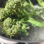 - Numa panela, coloque água suficiente para cozinhar os brócolis pra ferver e temperar a água com um tanto de sal. Assim que a água fervei, mergulhe os floretes de brócolis e depois de 1 minutos ou menos, retirei-os da panela. Tire o excesso de água dos brócolis e reserve numa tigela.