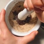 - Num pilão, coloque o gergelim torrado e macere bem até que esteja bem triturado e soltando o óleo interno da semente.